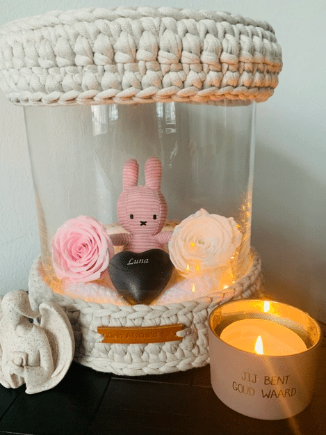 Moederliefde is zoveel sterker dan de dood. Inmiddels is het bijna 2 jaar geleden dat Luna geboren werd. We hebben haar een fijn plekje binnen ons gezin en ons leven kunnen geven. Ze is er altijd bij en ze hoort er ook echt bij. Elke ochtend doe ik het lampje van haar gedenkplekje aan en elke avond branden we kaarsjes voor haar.
