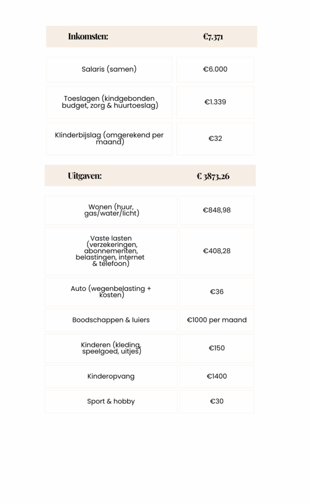 In de rubriek ‘Het Huishoudboekje’ krijgen wij een uniek inkijkje in de portemonnee van andere gezinnen. Wat komt er binnen, wat gaat eruit en hoeveel blijft er over om te sparen? Iedere week delen wij een nieuw huishoudboekje. Deze week: Joyce (33) en Dimitri. Samen runnen ze een druk huishouden met drie jonge kinderen, een hond en een poes.