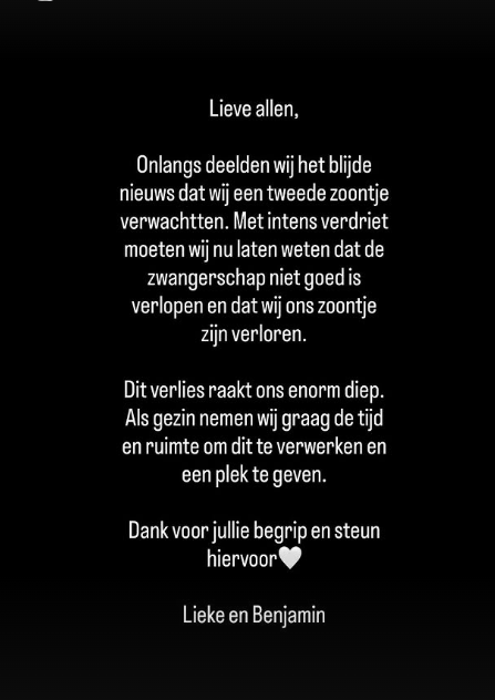 Via Instagram schrijft Lieke dat het verlies hen “enorm diep raakt”. Het stel vraagt om rust en ruimte om dit als gezin te verwerken. En die boodschap komt binnen, zeker voor ouders die weten hoe het voelt om hoop te hebben, plannen te maken voor de toekomst… en dit ineens los te moeten laten.